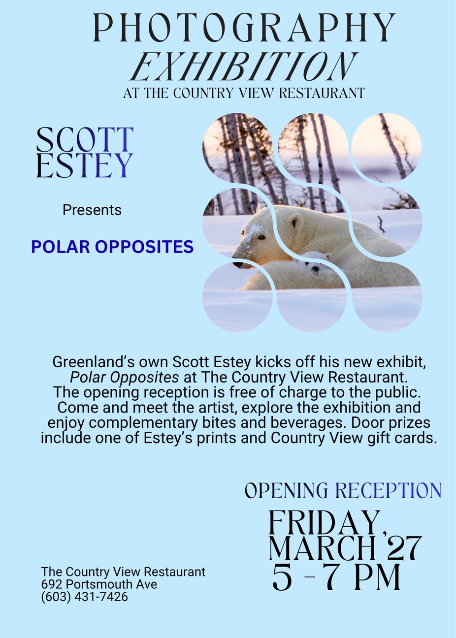 Scott Estey presents Polar Opposites, a stunning photography exhibition at The Country View. You are invited to drop in on Friday, March 27 between 5 and 7 PM for an Open House. Meet the artist, check out the exhibition and enjoy free bites and beverages as well as door prizes and a drawing. No reservation or RSVP needed - just come on by and support a local artist!